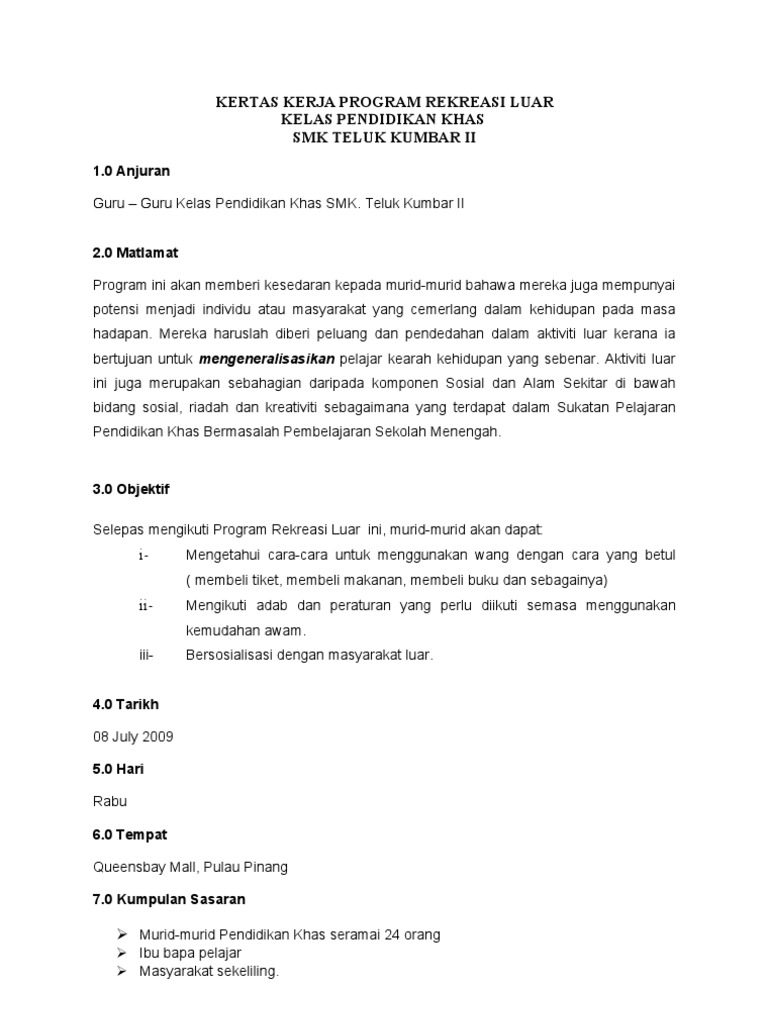 PENDAHULUAN Program ini dilaksanakan untuk membantu murid-murid sekolah ini meningkatkan prestasi mata pelajaran masing-masing. Mar 09 2014 contoh kertas kerja program 1. Program Tempat Kesejahteraan Taman rekreasi mini Balai raya Kg Kolam Keceriaan Hiasan Kampung dengan Setiap laluan strategic flora dan fauna Kampung 60 JADUAL PELAKSANAAN 61 TAMAN REKREASI MINI Bil 1 Aktiviti Tarikh Mula Tempat Kos 2018 Balai raya RM600000 Taman Rekreasi mini 611 PERINCIAN AKTIVITI TAMAN REKREASI Bil Aktiviti 1 Set.